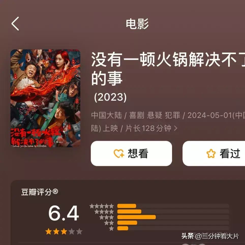 今年五一假期表现最一般的电影,应该就是杨幂主演的《没有一顿火锅解决不了的事》。五天时间票房仅仅只有4800w,预期票房大幅下调,从最开始的1.5亿一直调到7300w左右。评分也不高,6.4,不伦不类,悬疑片没逻辑,喜剧片笑不出来。看着前路一片迷茫,片方于5月5日,上映的第五天宣布撤档。之前就已经改过档期,现在上映了又逃跑,就算重开一局,恐怕也好不到哪去。